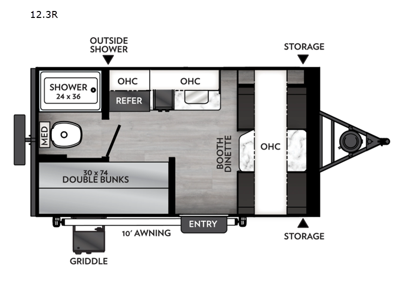 This model takes the tiny-trailer idea and makes it way more flexible for real trips. Up front, the booth dinette gives you a proper place to sit down for meals, play cards, or open up the laptop on a rainy afternoon, and it can still convert into extra sleeping space when you need it. The bunk beds add dedicated spots for kids or guests so you are not constantly tearing down and rebuilding your “bed” every night, which makes weekends and overnights feel a lot less chaotic. The rear corner bath keeps everything self-contained, and you still get that handy outside griddle and pass-through storage for chairs, tubs, and camp gear. It is a small trailer that actually functions like a little basecamp, with separate places to eat, sleep, and stash your stuff instead of trying to cram everything into one corner.