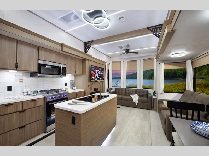You will love the residential features, such as a Serta mattress in the bedroom, stainless steel kitchen appliances, and solid surface countertops. There are also adjustable textured roller shades, a 60k on-demand tankless water heater, and a 106" interior height in the living room for added space. Outside, 4K awning "Blade Lighting" will keep your space well illuminated, while JBL speakers let you listen to your favorite tunes.